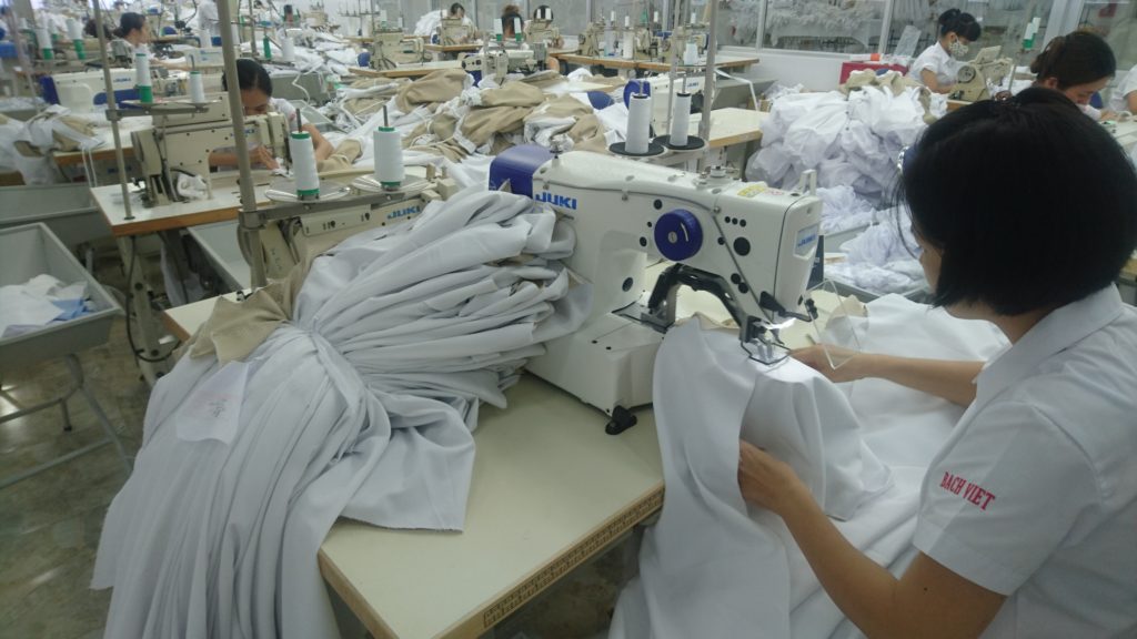ベトナムは人口9600万人、国民性はとても勤勉でおおらかです。また親日で若い人は日本のことを学んでいます。その縫製工場は10年も前から日本人技術者が特殊な縫製技術を丁寧に指導し、ベトナム人の勤勉性もあり今では世界で最も技術力のある工場へと成長しました。弊社のHACCP製品はこの工場で生産されたユニフォームを福島県で提供しています。今回の視察でさらに自信を持ってお勧めることが出来ることを確信する有意義な視察となりました。